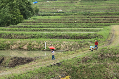 田植えの後、お百姓さんたちは片時も目を離さず田の管理をされているようでする。このときも偶然出会い何枚か撮影することが出来ました。幸いなことに一輪車でご主人が藁らしきものを乗せておられるようでこれから水落の手入れに行かれることなのでしょうか・・・